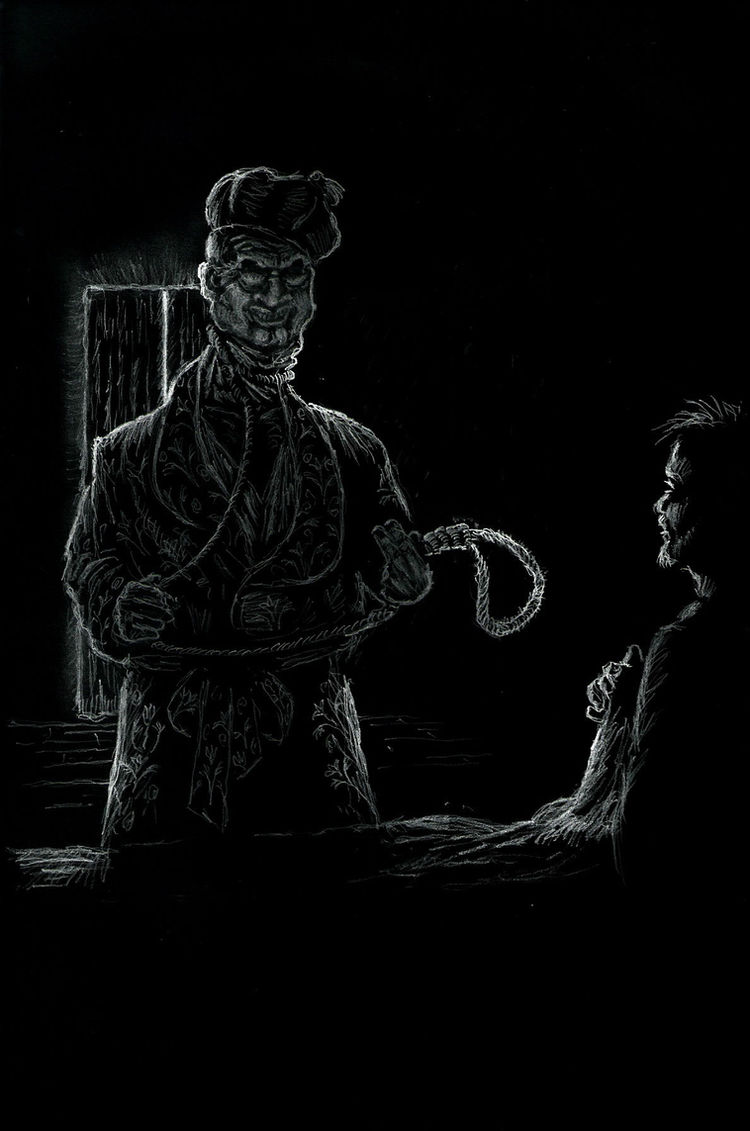 Worse still, they often exhibited the marks of their mortality with exhibitionistic glee: heads slumping on broken necks or tilting back to expose the gaping wound of their cut throats (“like another mouth, wide open”). These are ghosts that cozy up to their humans in disquietingly comfortable ways – often to illustrated the way that their humans have cozied up to the ideas that they themselves represent: various combinations of greed, wrath, lust, sloth, gluttony, envy, and pride (in “Squire Toby’s Will,” a wrathful, gluttonous father and his two sons – one greedy, proud, and lustful and one envious and slothful – very intentionally represent each of the seven deadly sins).